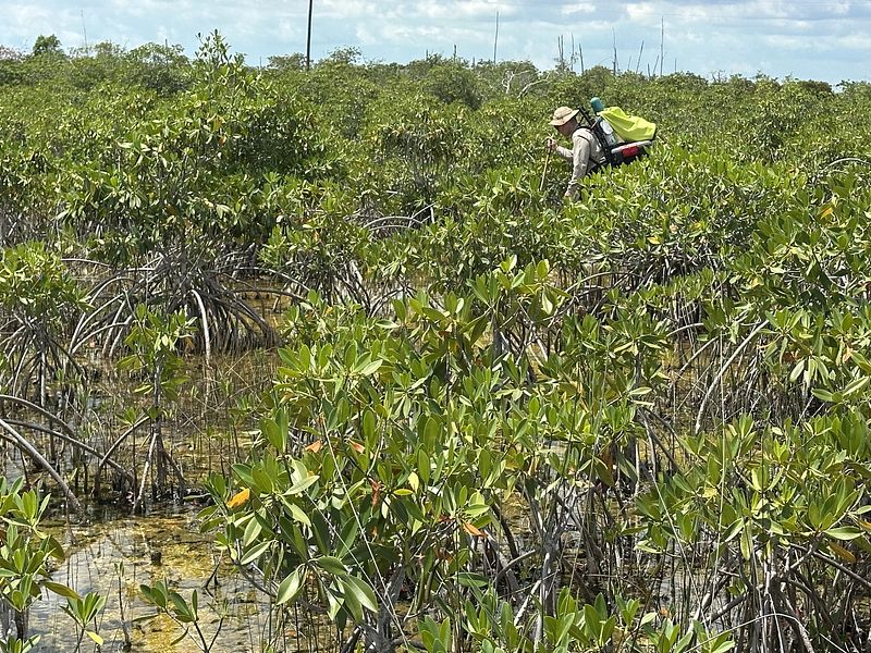 Hiking back through the mangroves from a calibration/maitenance trip to SE1/US-EVM flux tower - August 2025